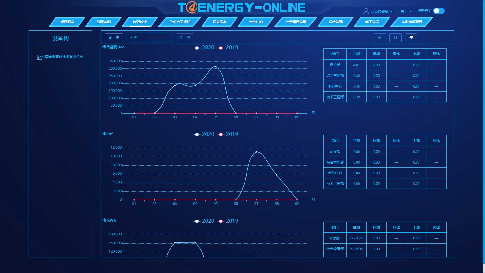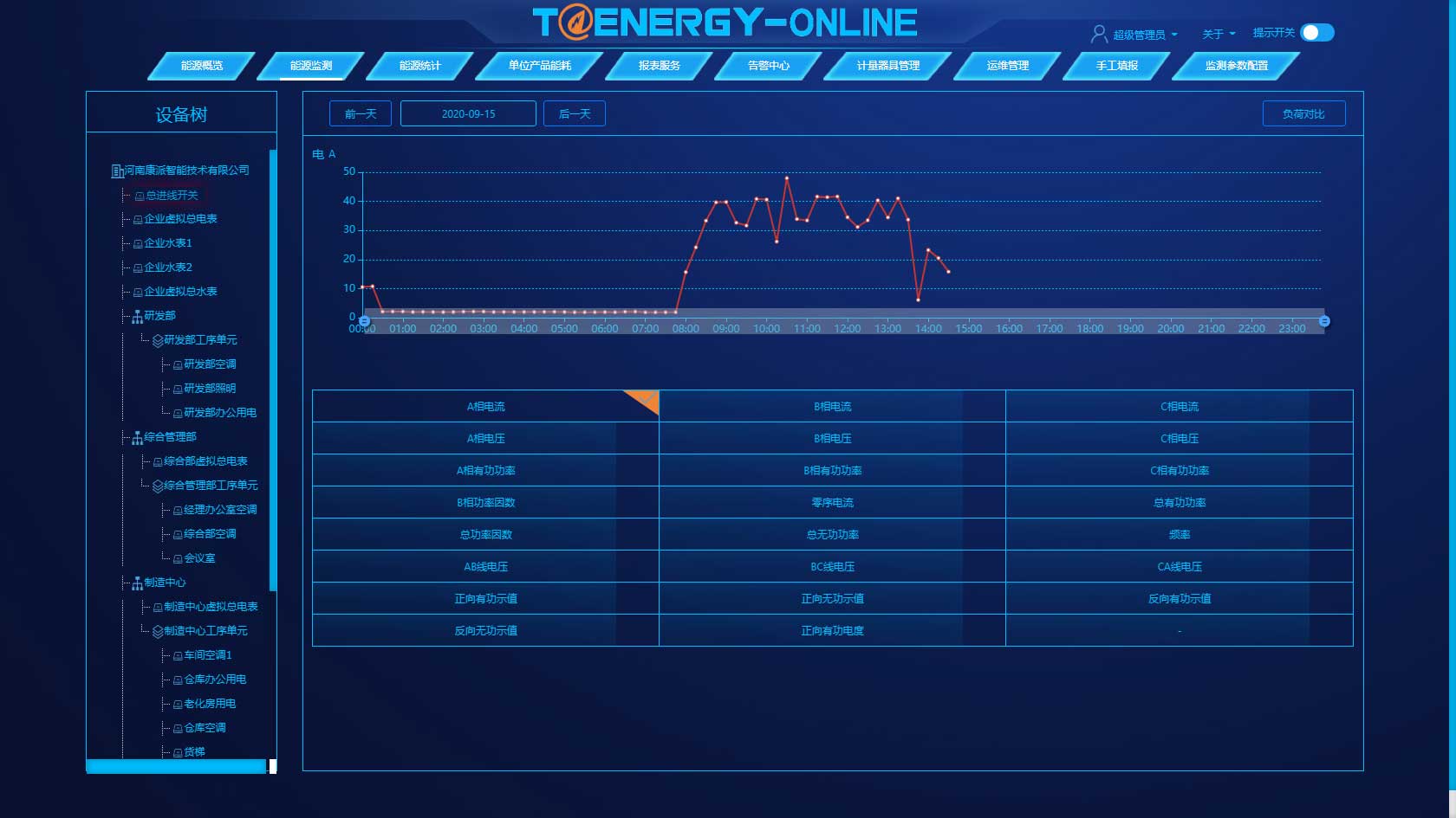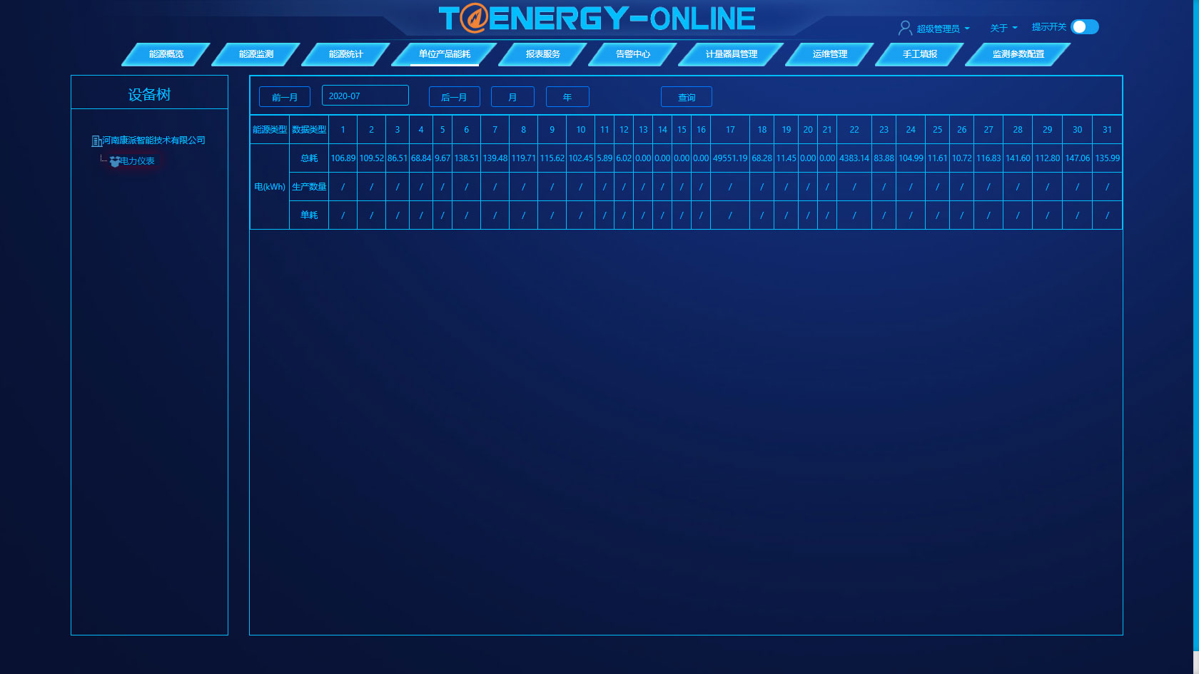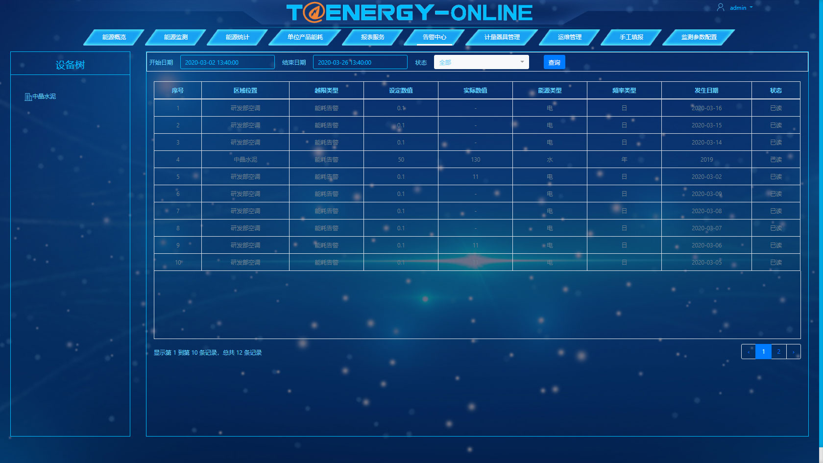 告警中心是按照日、月、年设置企业、部门、工序、设备的能耗预警值、告警值,使工作人员及时发现设备异常情况,供相关人员分析和处理。