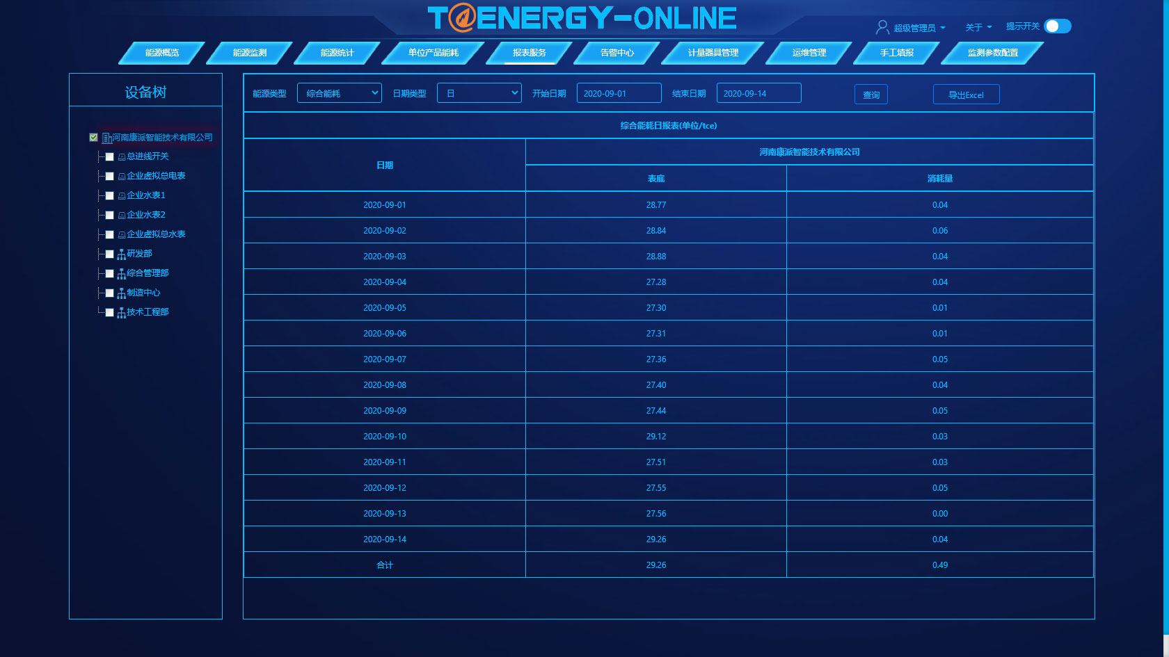 报表服务包含有日报表、月报表和年报表。通过多样化的报表服务满足生产现场的多种多样需求。报表设有打印功能,可定时自动打印或触发条件打印,并可导出到excel表格中,显著减少抄表工作的人力成本,提高用户的经济效益。