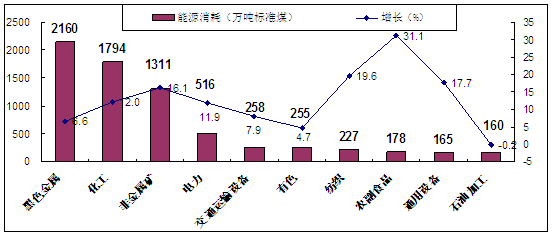 我国8个主要耗能工业行业的单位产品能耗平均比世界先进水平高47%以上,8个行业的能源消费占工业部门能源消费总量的73%。