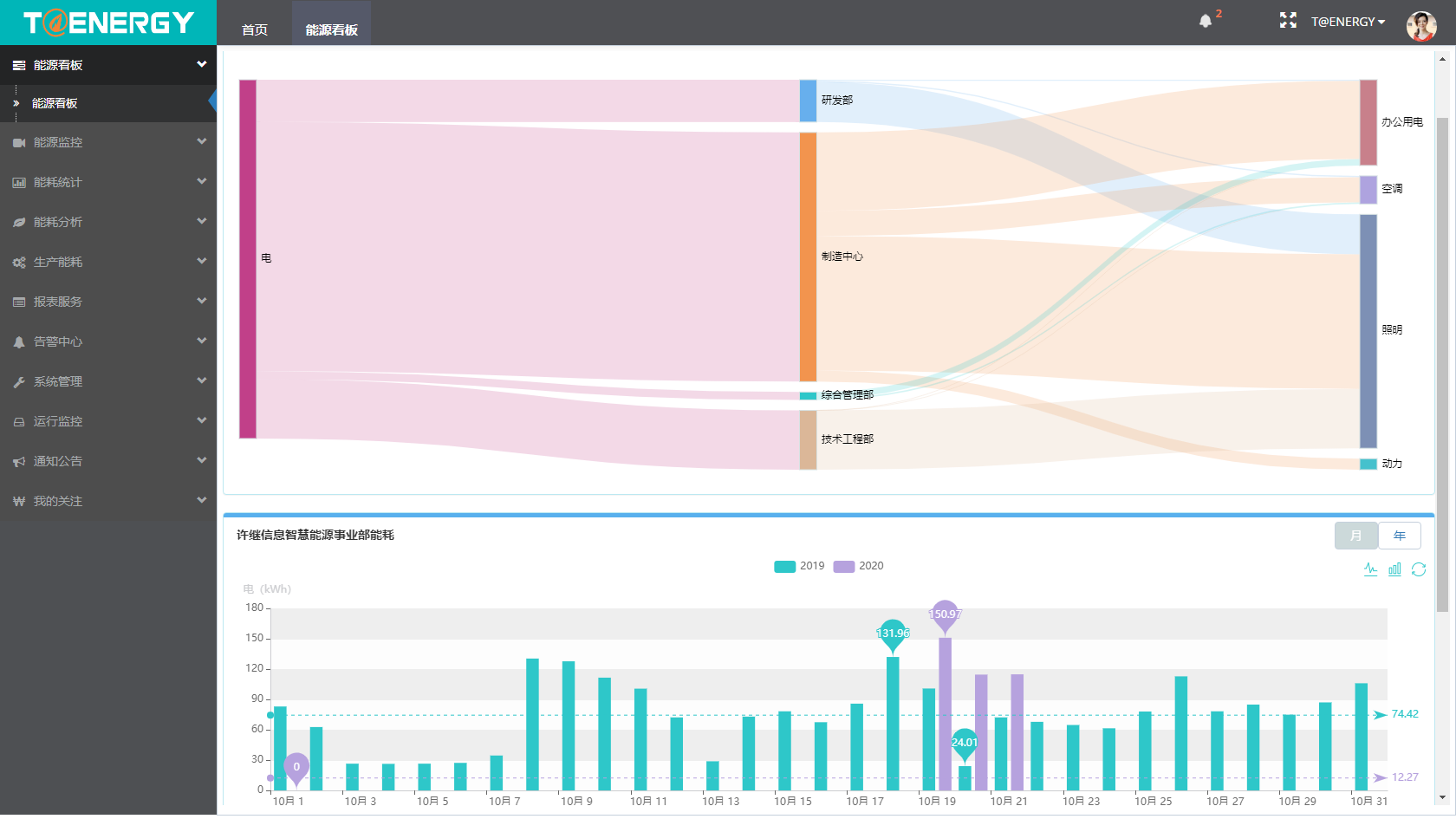 能耗统计可将各种能耗介质(水、电、气、暖等)以及企业中各部门及各监测点实际用能情况,通过不同的展示方式展现出来。