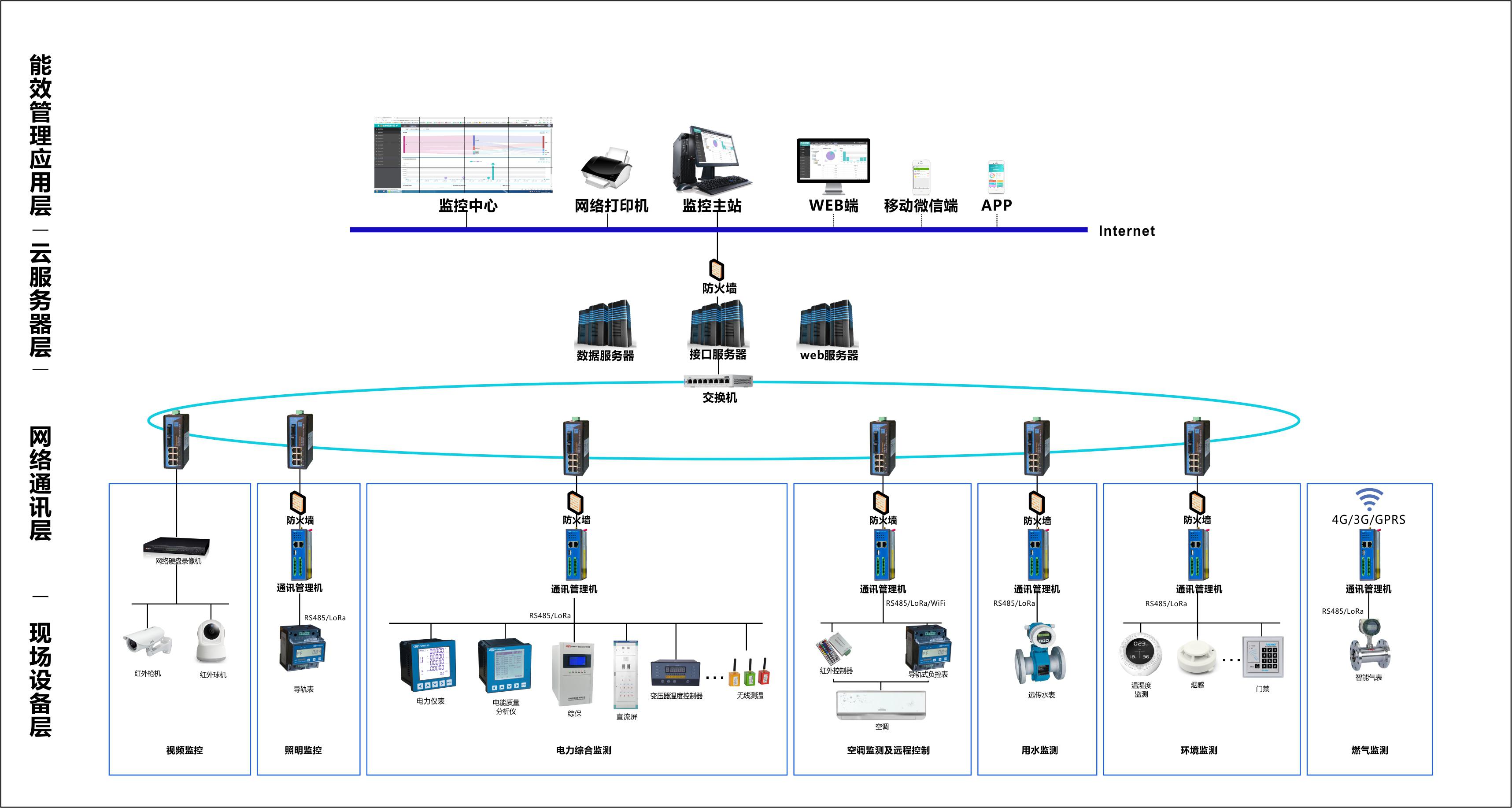 作为能源管理系统的大脑,集合了数据服务器、接口服务器和应用服务器三个功能中心,能够处理网络通讯层传输的各类数据,对数据进行存储、转发、分析、管理等作业。