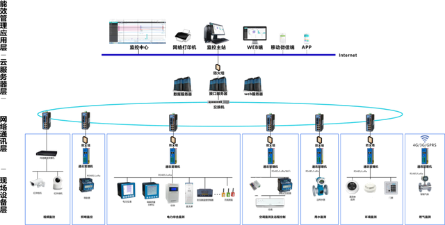 现场设备层:主要是连接于网络中用于水、电、气等参量采集测量的各类型的仪表等,也是构建该配电、耗水、耗气系统必要的基本组成元素。肩负着采集数据的重任,这些设备可为本公司各系列带通讯网络电力仪表、温湿度控制器、开关量监测模块以及合格供应商的水表、气表、冷热量表等。