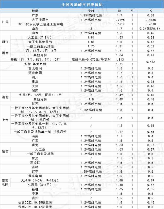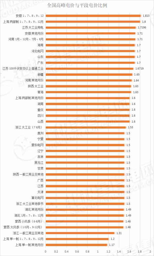 尖峰电价:总体来看,绝大部分地区的尖峰电价是在高峰电价的基础上上浮20%,部分地区,如广东、上海、辽宁的尖峰电价是在高峰电价的基础上上浮25%。山东、湖北尖峰电价均是以平段电价为基础进行上浮。其中山东尖峰电价上浮100%,即为平段电价的2倍,湖北1、7、8、12月的尖峰电价浮动比例为2,其他月份尖峰电价浮动比例仍按原来的1.8执行。安徽尖峰电价是在当日高峰时段电价基础上每千瓦时上浮0.072元。