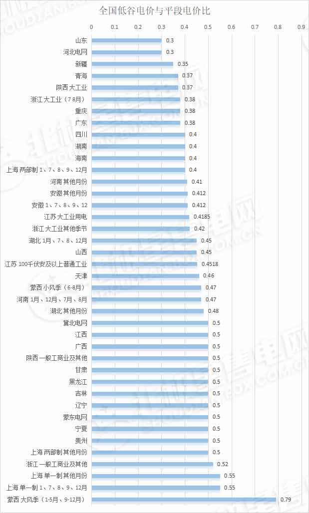 低谷电价:全国来看,低谷电价与平段电价的比例在0.3-0.79之间(即低谷电价较平段下浮21%-70%之间)。其中山东和河北电网的下浮比例最大,达到70%,山东还设置深谷电价,深谷电价下降90%。蒙西大风季(1-5月、9-12月)谷电价格下浮比例最小,在平段价格的基础上下浮21%,小风季下浮53%。冀北电网、江西、广西、陕西(农业/一般工商业及其他用电)、甘肃、黑龙江、吉林、辽宁、蒙东、宁夏、贵州和上海一般工商业及其他两部制、大工业两部制其他月份用电的谷段电价均下浮50%。