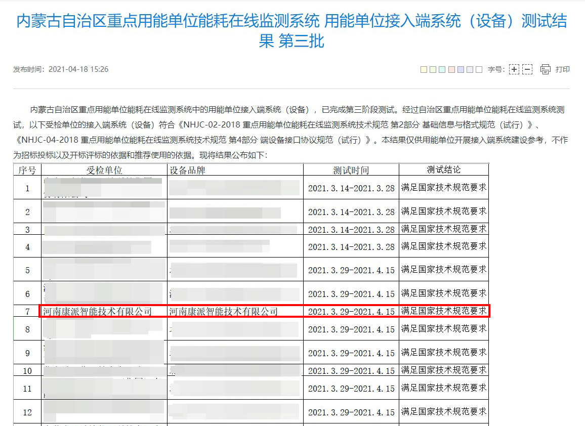 2021年4月18日,内蒙古自治区重点用能单位能耗在线监测系统中的用能单位接入端系统(设备),已通过第三阶段测评。经过内蒙古自治区计量测试研究院测评,澳门新葡平台能耗在线监测端设备符合内蒙古自治区重点用能单位能耗在线监测系统技术要求。公布结果如下图所示:
