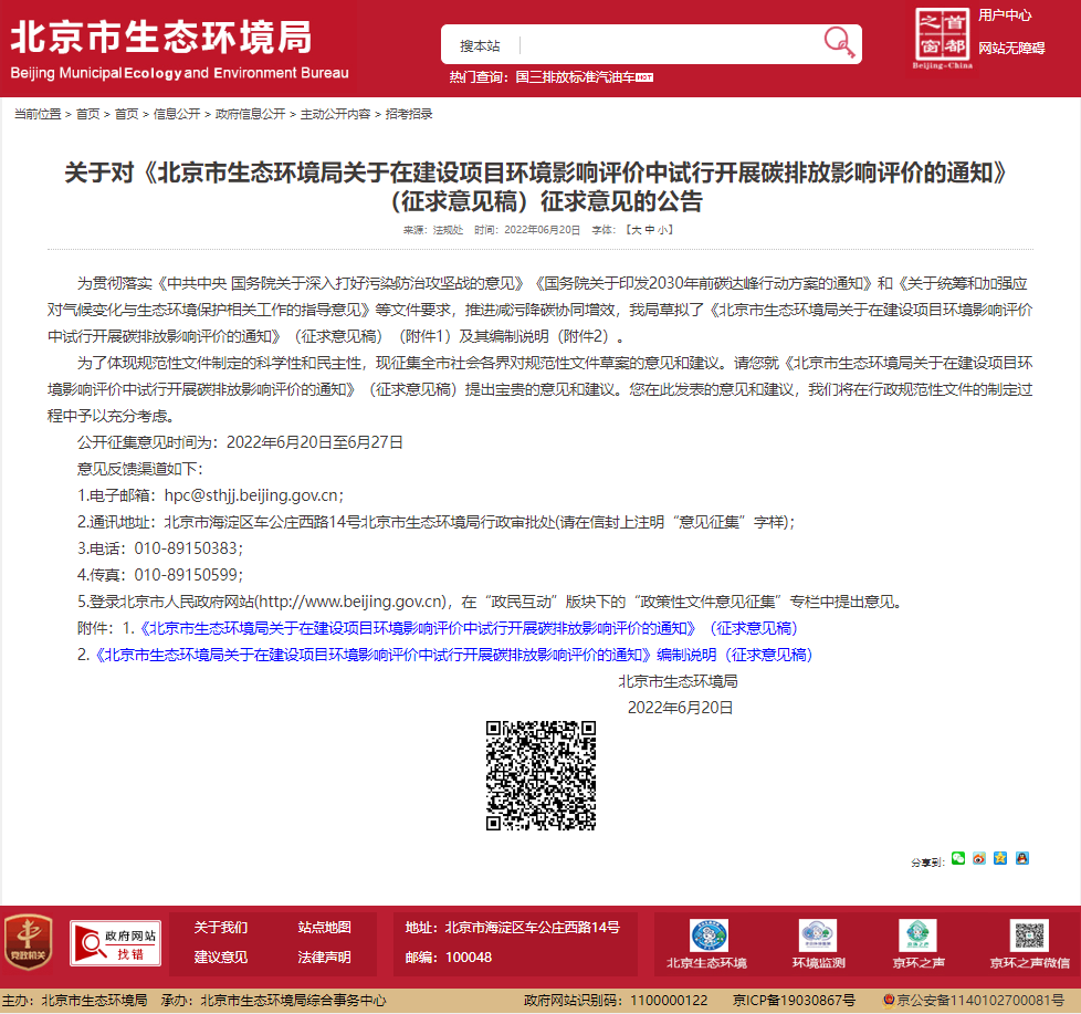 北京市生态环境局官网6月20日发布公告,就《北京市生态环境局关于在建设项目环境影响评价中试行开展碳排放影响评价的通知》(征求意见稿)公开征求社会各界意见。
