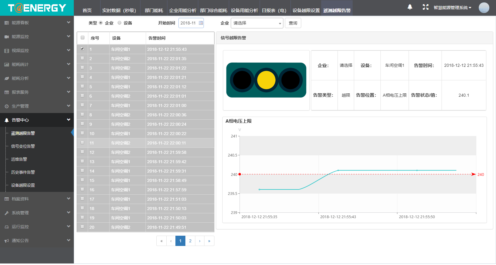 能源管理系统平台告警及预警功能丰富,可以对事件、变位进行告警和查询。用户通过对设备的运行限值进行设置,当运行参数触发限值时,系统就会自动弹出报警信息。该信息包含时标,可以准确发生的时间,为设备检修和故障判断提供了依据。
